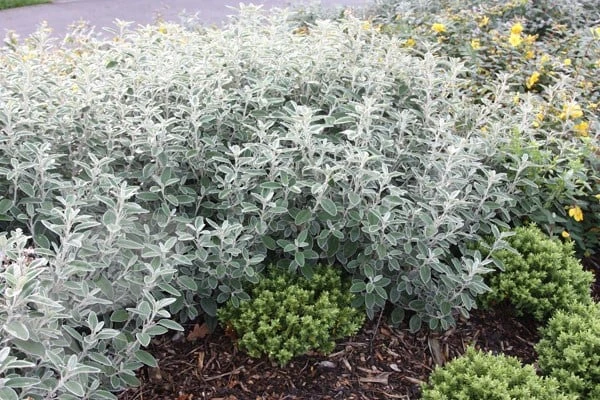 A tough little evergreen shrub with oval, hairy, grey leaves and cheerful, bright yellow, daisy-like flowers in June and July. It’s drought tolerant and forms a natural mound. Try it with other silver-leaved plants or as part of a Mediterranean scheme or as a groundcover for a sunny, well-drained site. It’s particularly suitable for coastal gardens as it stands up well to strong winds and salt-laden air.