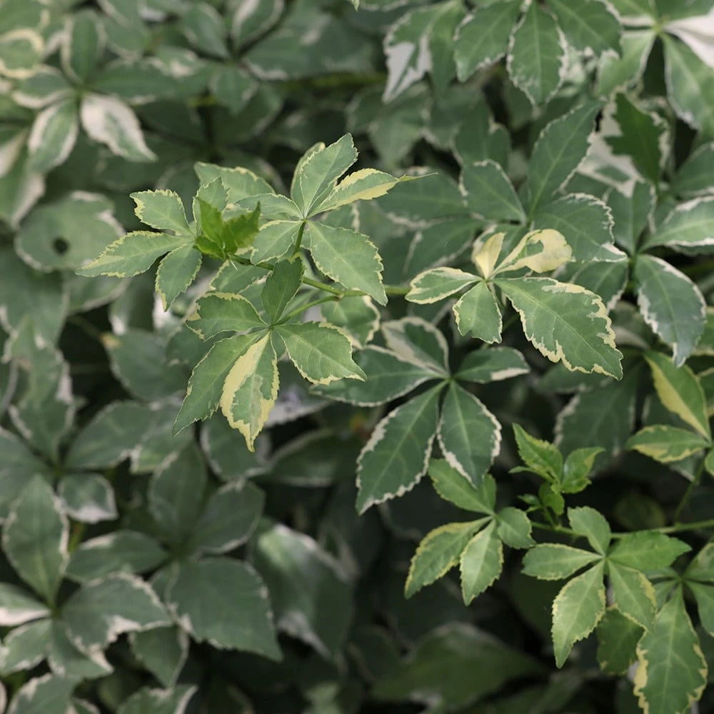 An excellent foliage shrub for shade gardens, shrub borders or screening, with small greenish-white flowers appearing in globe-like umbels in spring, remeniscent of ivy flowerheads. Flowers on female plants (species is dioecious) may give way to small black berries, but most plants sold in cultivation are females so fruit is rarely seen. ‘Aureovariegatus’ features striking variegated foliage in which the five-fingered palmate leaves are bright green edged with white. With small, sharp thorns, it also makes a good defensive hedge, and is tolerant of drier conditions (once established), urban environments, and poorer soils.