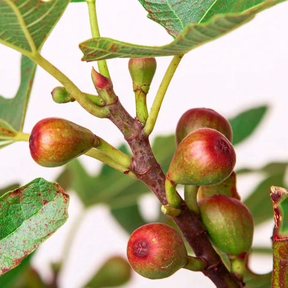 Figs are capable of producing three crops of fruit every year, but in our climate it is the tiny little ones that you find tucked into the leaf axils in autumn, that if protected from frosts, will go on to ripen in their second summer. Therefore if you are growing the fig for its fruit rather than its foliage, you should remove any developing fruits that are larger than a pea in autumn, and either cover the crown of the tree with a blanket of frost fleece or try to gently pack it with straw. This will keep them snug and warm throughout winter and push the plants energy into the development of the young fruits, which should grow into fully ripened figs next year.