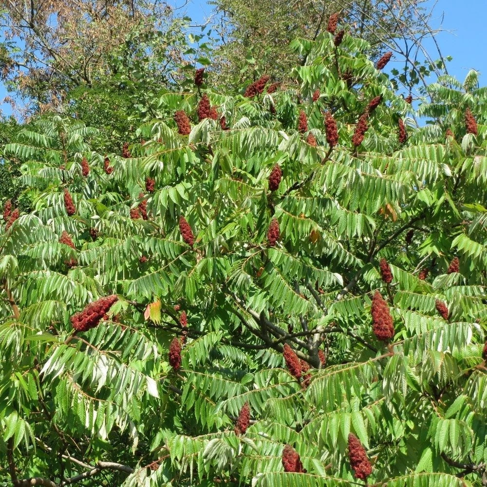 An upright, deciduous shrub or small tree, that is primarily grown for its finely-cut dark green leaves, which turn spectacular shades of orange-red in the autumn before they are shed. Cone-shaped clusters of yellow-green flowers appear in summer, and on female plants, these are followed by hairy, deep red berries. Stag’s horn sumach is an excellent specimen for a small sunny garden, but as it spreads by suckering, avoid planting it too close to a lawn. Alternatively, you can limit its spread by surrounding the roots with a non-perishable barrier.