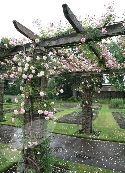 When planting against a large tree, dig a hole about a metre away from the trunk and angle the rose towards the trunk. The tree must be mature and strong enough to take the weight of the rose. Or you can train the rose up to the crown of branches, using wooden supports. In this case the rose should be planted on the outer reaches of the tree’s canopy. Allow it to scramble up the supports and then into your chosen tree.